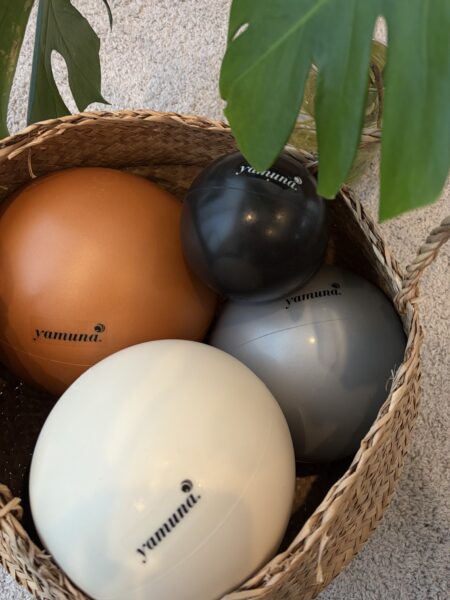 ボールに身体を預け、呼吸とともに身体を整えていくヤムナ。